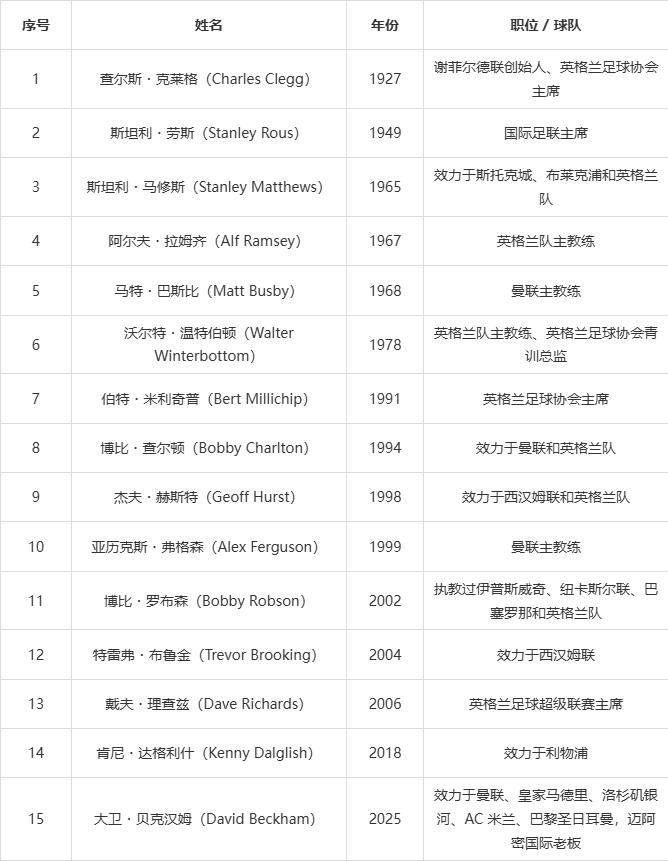 迄今为止,仅有15位足球界人士获得爵士爵位,这足以看出该奖项的崇高地位和稀有程度。