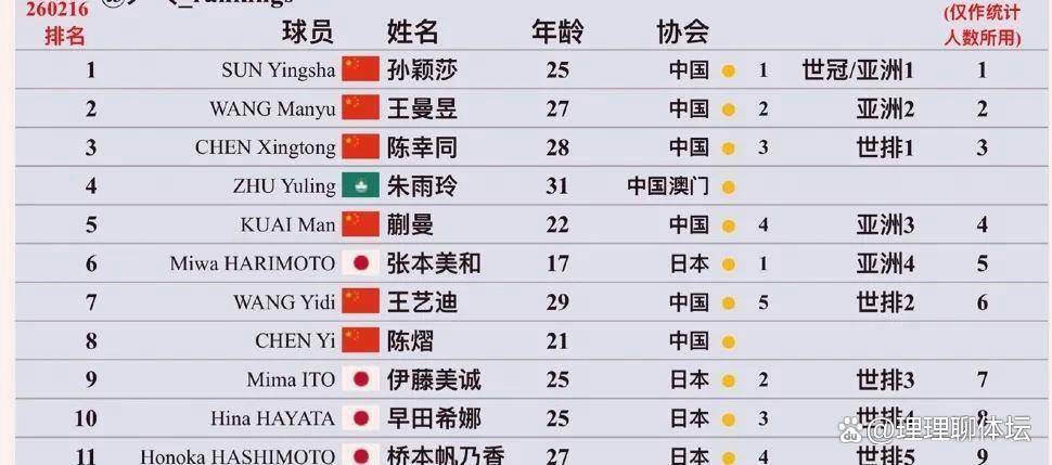 代表中国澳门出战的朱雨玲凭借近期在多哈等赛事中的出色表现,积分飙升至4790分,强势回归世界第四。