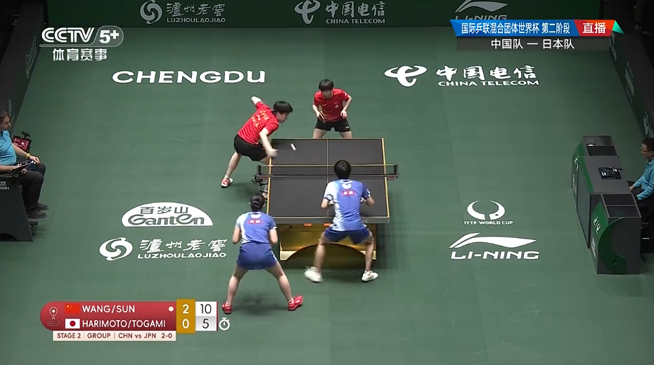 首场混双比赛,王楚钦/孙颖莎3-0战胜户上隼辅/张本美和,三局比分为:11-4、11-6、11-5。中国队大比分3-0领先。